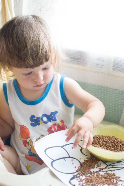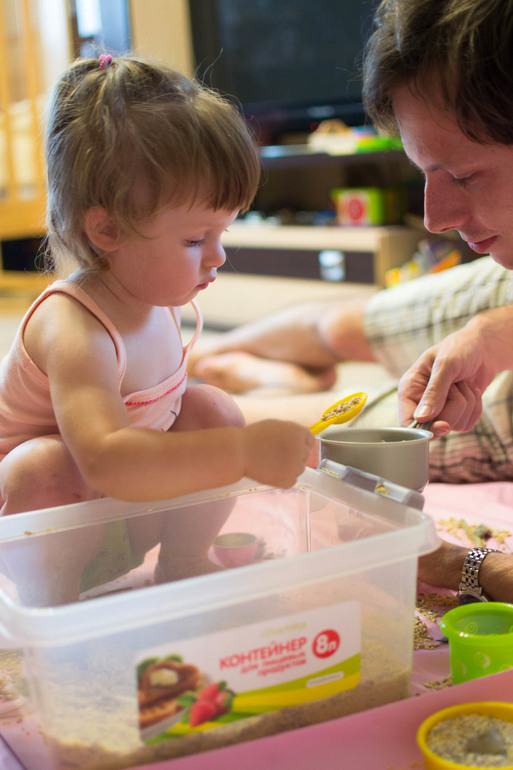 15. Сенсорное восприятие. Ребенок не любит когда в коробке крупные предметы, поэтому основным материалом было пшено и овсянка. Набросали туда цветов, камешков, листьев и палочек, собранных на прогулке. Сначала все инородные)) тела были извлечены - вытащили палки и листья, цветы были перенюханы. Потом начала пересыпать ложками, кружками и поварёшками крупу в разные емкости.