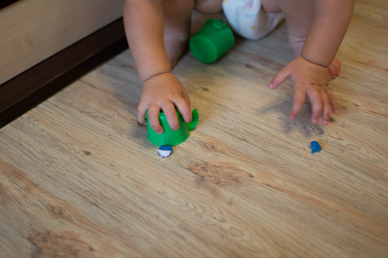 8. Угадай где. В первый день не отреагировала на просьбы вообще - поднимала оба кубика под которым был спрятан желудь, на второй день угадала 2 из 3. А на третий я поняла что надо ребенку))) Под кружку спрятала кусочек пластилина, и раза 2 ребенок отгадал правильно, а потом решила что пора уже заполучить этот кусочек пластилина всеми правдами и неправдами - снова начала поднимать обе кружки.