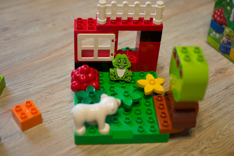 16. Конструирование. Делали солнышко из прищепок, Аня пока умеет только снимать. Строили домик для лягушки, к которой иногда приходит медведь (правда белый).Строила я, Аня попрыгала лягушкой и разобрала.