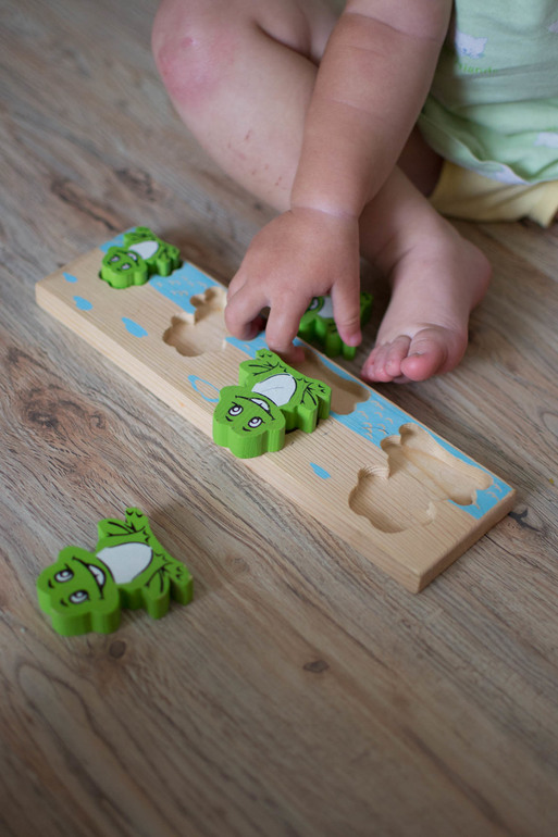 Играли с вкладышами. На место правильно попала самая маленькая лягушка.