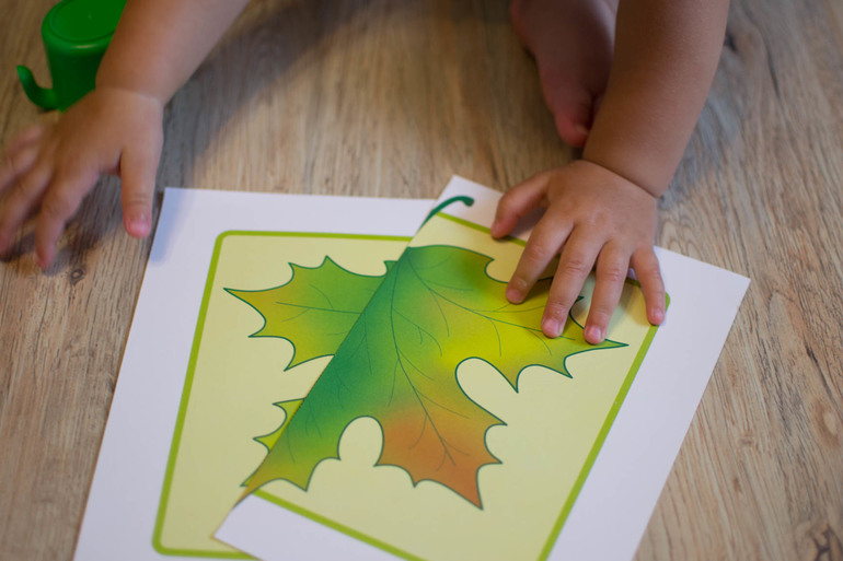 12. Разрезные картинки почему-то раньше ребенку не давала. Ей не особо нравятся всякие вкладыши, я думала что и это не оценит. До собирания конечно ей еще далеко но кое-что получилось. Положила 2 рисунка половинок листа и половинку бабочки. Аня выбрала половинки листа и совместила