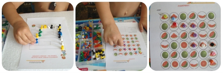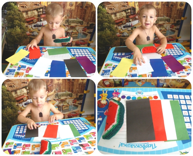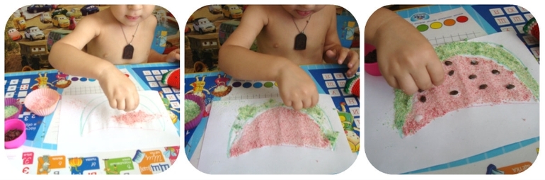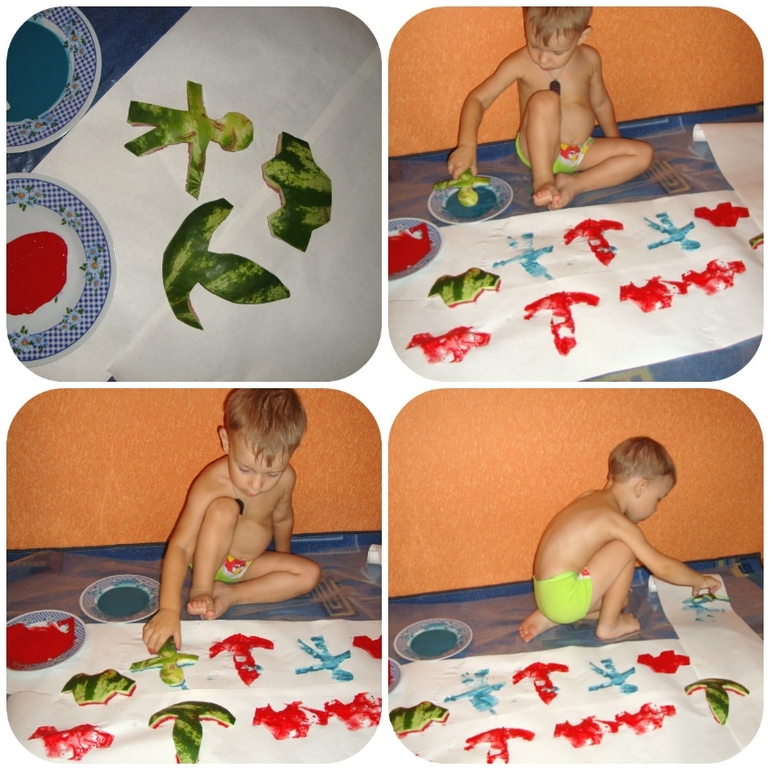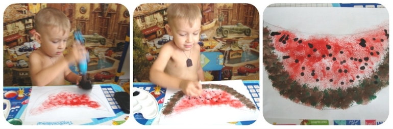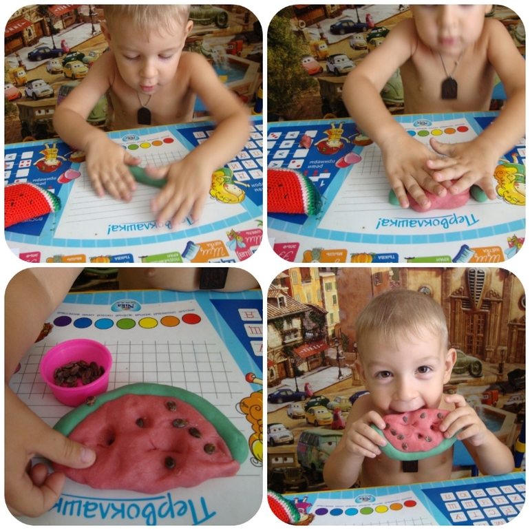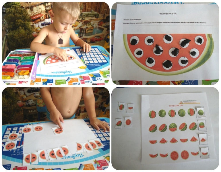 Рисовали штампами из арбузных корок. Это у нас парусник, машинка и человек. Для этих заданий отвели отдельный день - занимались и творили. Сделали косточки из пластилина. С лото из фигур - справился без проблем. А вот, с "продолжи ряд" были трудности - объясняла каждую строчку. "найди лишнее" и "тени" - для сына уже самые легкие задания. Лабиринт был у нас из силовых кнопок, а другой из пуговок (но заставил сына по психовать - он долго не понимал, что я от него хочу) Подбирали цвета к дольке арбуза, а затем распределяли цвета по слоям. Рисовали с помощью губки - человечка (из фикс-прайса) и косточки из ватной палочки. Вырезали - с трудом, но получается. Обводил фигур - по своему , конечное. Из самодельног теста для летки сделали дольку арбуза с настоящими косточками. Так же у нас была еще одна долька - из крашенной манки.