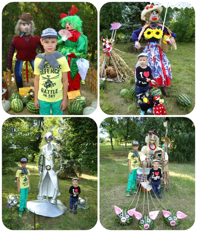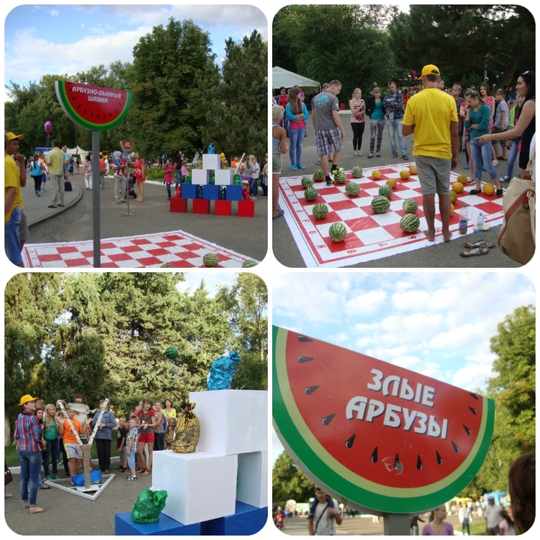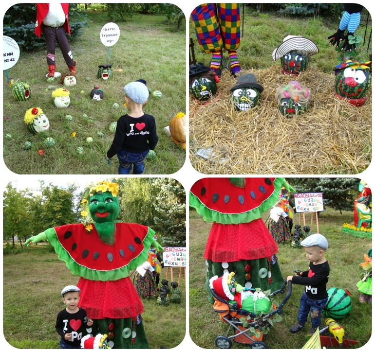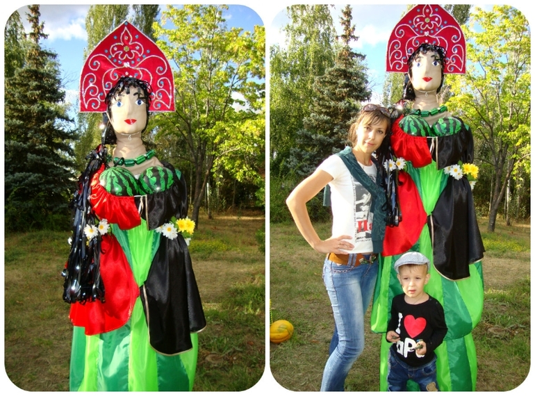 В городском парке в этом году в первые была выставка чучел (делали их местные детские сады).. и все с теме же арбузами. Я правда, прослушали какая фигура заняла первое место - но, мне лично, очень понравились эти две - НЛО (арбузы там серебренные) и Баба-Яга с поросятами. Ребенку понравились мордашки и Фиона, он даже покачал ее малыша. А это барышня- краса - украшение праздника!!!!! Так же в парке были конкурсы для молодежи - Арбузно-дынные шашки, Арбузный дартс, Арбузный боулинг Для малышей - рисунки на асфальте. Нам за рисунок дали чупа-чупс. Выступали рок группы. А мой малыш - позировал в это время на другой сцене.