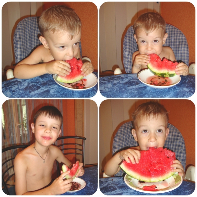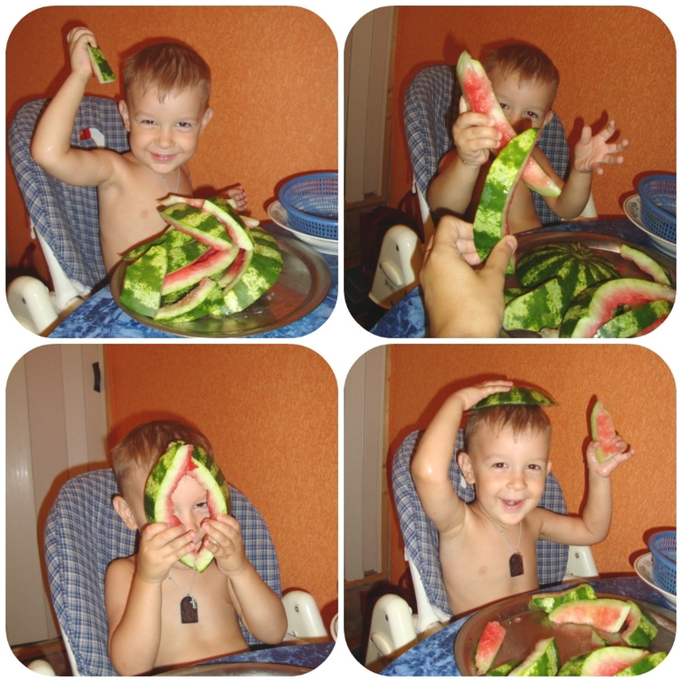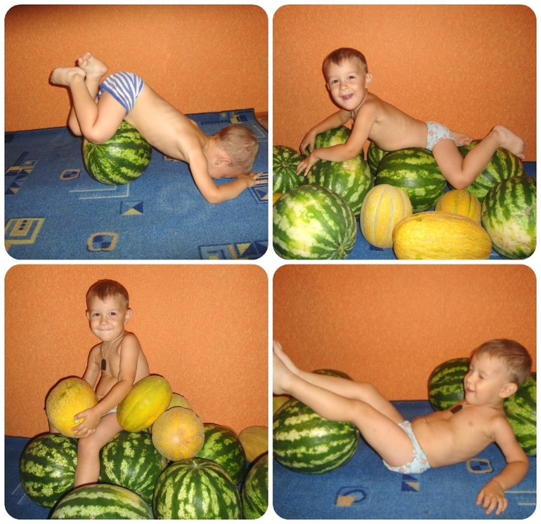 Кирюша арбуз пробовал в первые! В этом году они особенно вкусные! Арбузы у нас местные и из проверенных рук - так что я не переживала нисколечко. После трапезы - было конструирование - сын, хоть и чистюля, в таком решил перепачкаться. Подурачились вдоволь - даже по фехтовали корками. Вот такое у нас было изобилие. Кирюша, даже решил, что он тут будет спать. Поиграли в преобразование - как раз в этот день, ходили на парад в честь дня ВДВ. Получился у нас десантник и ежик-переросток. мммммммммммммм.. вкусняшки - делала смузи - как в заданиях (с апельсинами) и даже (в первые в жизни) варила варенье из арбузов. Все сказала по вкусу напоминает мед.