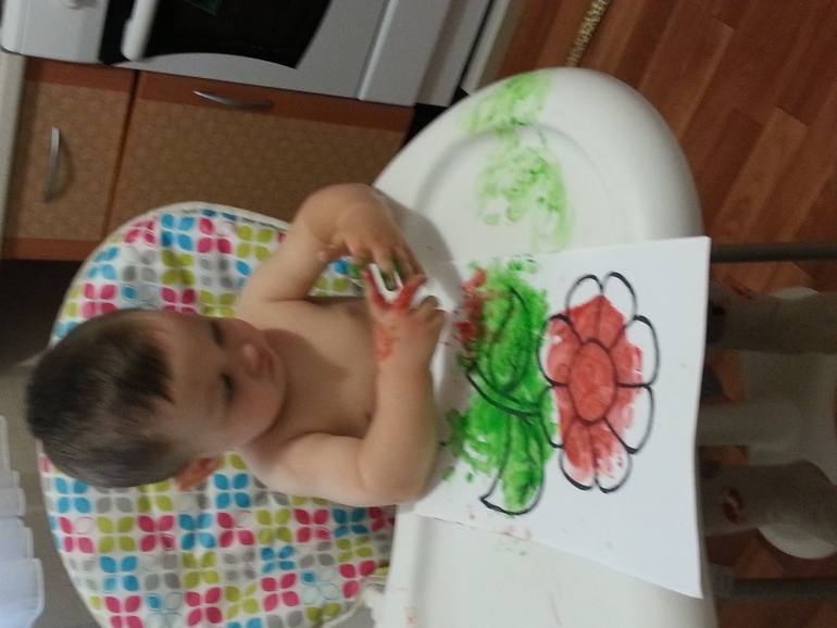 Далее с открытками))) Я только сейчас поняла, что нужно было раскрасить фартук. Мы же решили подарить бабушкам цветы. Как и любая творческая личность, Никита вышел за рамки обычного и разукрасил не только цветочки, но и стол, стул, и себя))