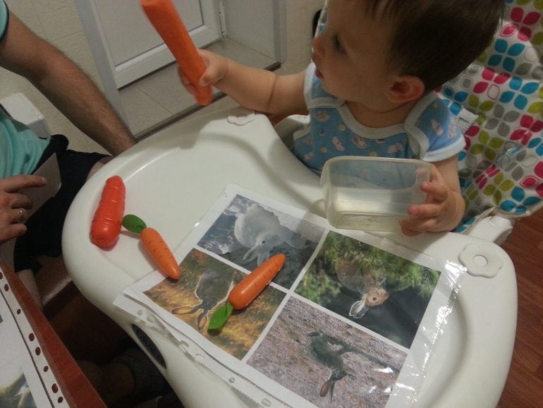 Морковка для зайчика у нас была разная: и деревянная, и пластмассовая, и настоящая! Мы ее и осмотрели, и повертели, и погрызли.Но класть в контейнер ее отказывались, просто убегая с ней.