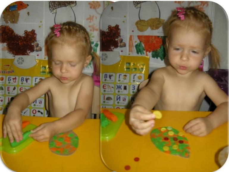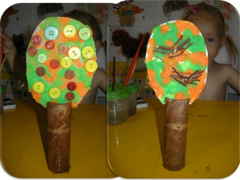 И Вика заплакала понарошку, говорит "А горобчику нема де жить". Тут мы принялись делать дерево: и лепили и рисовали и всаживали пуговицы и прутики