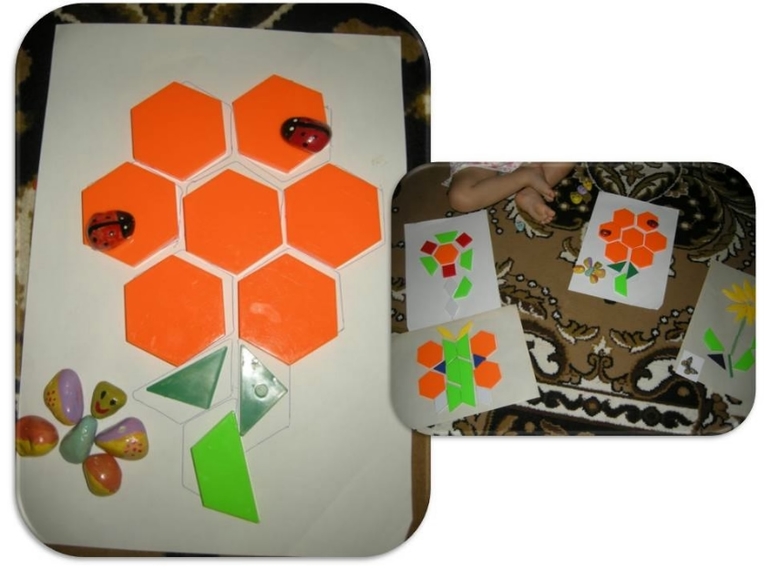 Я достала папку с заготовками для Шичида занятий наших, и достала оттуда бабочку и нашлось аж три цветка, вот Вика все и разложила, так как с этим уже давно справляется, но было ей интересно сразу несколько сложить, благо фигур хватило, только один желтый тонкий ромб пришлось заменить нам на белый потолще))