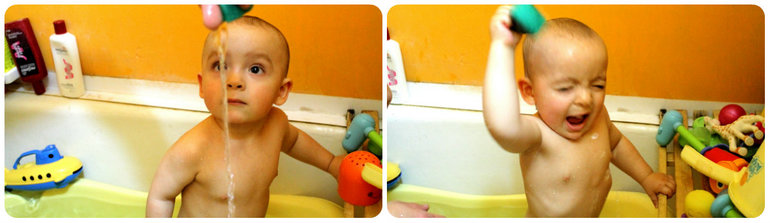Уже перед ночным сном в ванной они играли, изображали дождик губкой, изначально папа показал Мишане как это делать, затем Миша обрызгал прям всех с головы до ног (прошел ливень))))