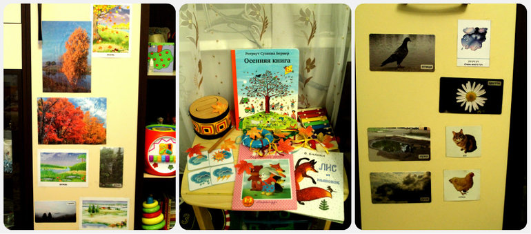 С утра когда Миша проснулся, сразу подбежал к шкафу где висели новые картинки, на осеннюю тематику(я часто вешаю, разные картины, для общего развития))) Даже не успев умыться, решила, эхъ расскажу, рассмотрим,и Миша заинтересовался, ему ох как понравилось))) Так же я выложила перед ним карточки с погодой,и мы решили что сегодня солнечно, хотя Миша все показывал на дождик (будущий метеоролог, учитывая что вечером начался дождик) .