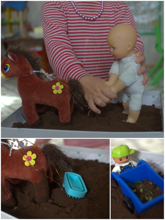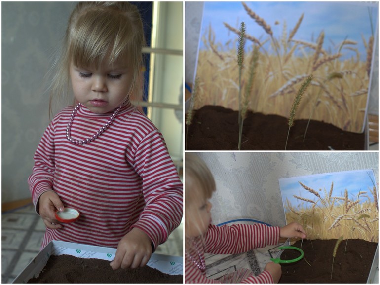 Сеем зерно - выросли колоски, срезаем их серпом (изначально - пластмассовый сачок), Алисе понравилось, потом еще хотела. Прослушали Чайковского "Времена года" (Жатва и Песня пахаря). Нормального зерна, к сожалению, не достать, поэтому сорняки в их роли:)