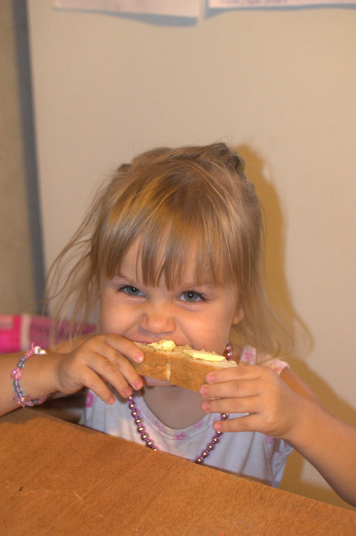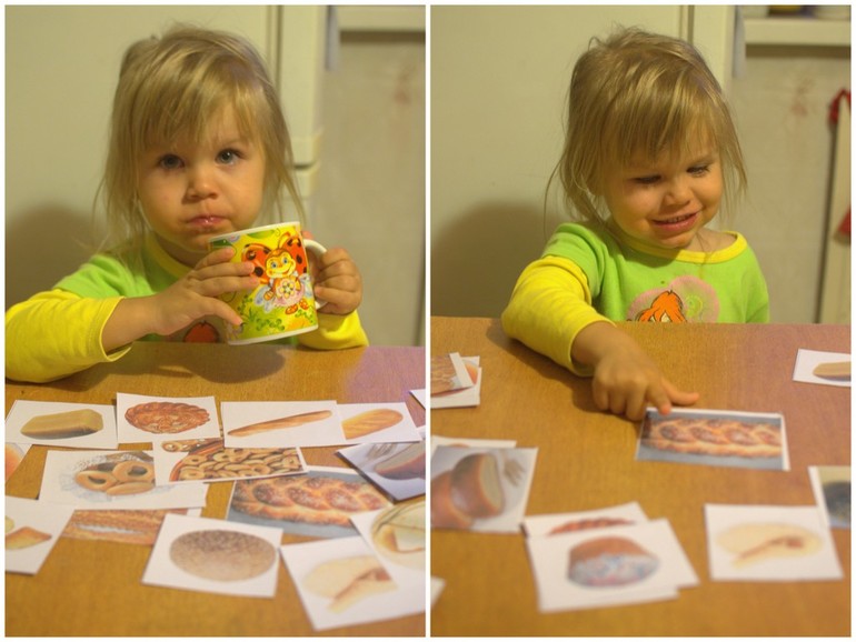 Смотрели в презентации разные виды хлеба, Алиса говорила "Это хочу! И это хочу!" Распечатали разные виды хлеба, сортировали по признакам: прямоугольные, овальные, круглые с дырочкой. Заодно названия узнавали. Про сайку Алиса сказала, что она такое не ела:)