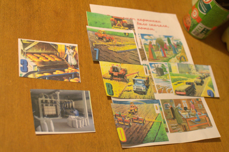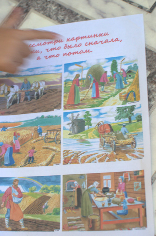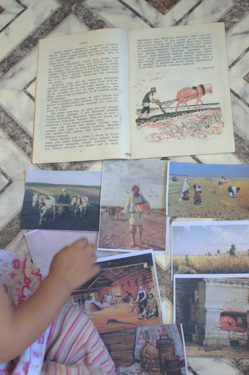 Читали Ушинского "Хлеб", предложила Алисе выбирать карточки по смыслу. Еще нашла материал, кое-что из него добавляла по ходу рассказа.