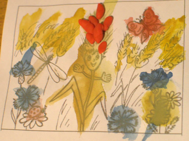 Раскрашивали, лепили зерна из пластилина. В данном случае я сидела рядом, обсуждали цвета (иначе бы опять получила единое пятно коричневого цвета:))