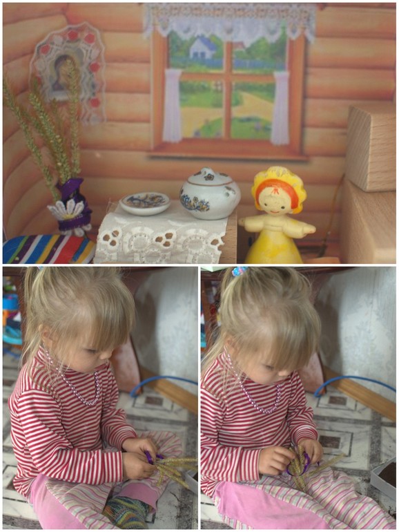 Первый сноп - зажиночный, его украшают и ставят в красный угол. Дала Алисе его связать, здорово, что она пробовала разные способы (правда, все равно не вышло хорошо связать самостоятельно:))