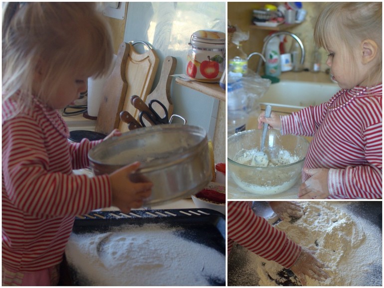 Приступаем к выпечке настоящего хлеба. Алиса просеивает, играет с мукой, помогает замешивать тесто.