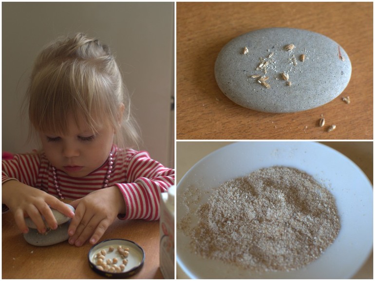 Пытаемся добыть муку с помощью "жерновов", а потом лихо справляемся с помощью мельницы-кофемолки:)) Мука, хоть и из зерен пшеницы, но отличается от магазинной цветом, т.к. прямо в оболочке смололи.