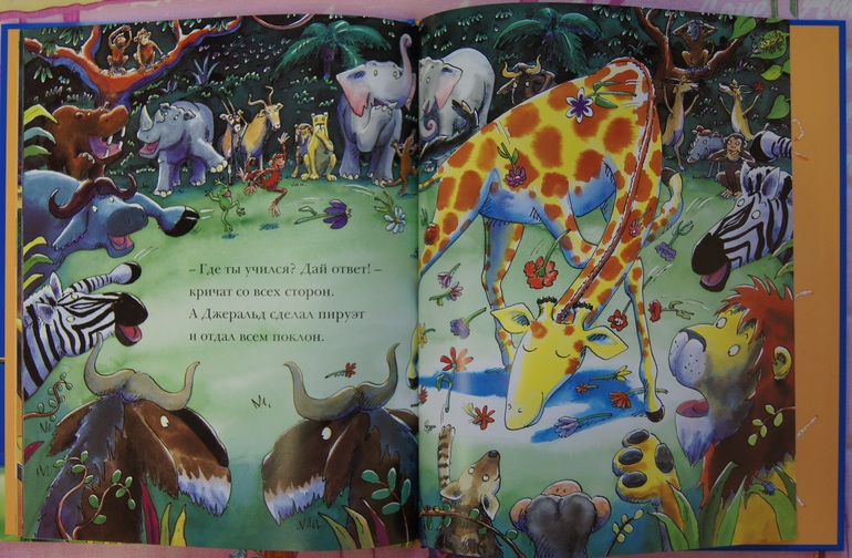 Представили, что мы обезьянки, лазающие по деревьям, поскакали и попрыгали. Потом решили побыть слонами, соединили ладони рук вместе и выставили руки вперед, типа это наши хоботы, походили. Тут Алиса вспомнила фрагмент из книги-гляделки В зоопарке издательства Улыбка, как мама слониха поливает слоненка и тоже решила набрать в хобот воды и пообливаться, конечно же понарошку.