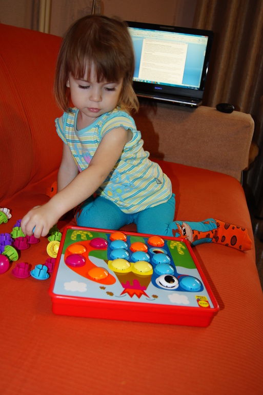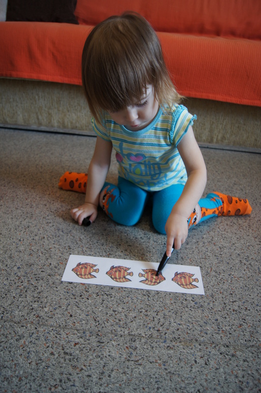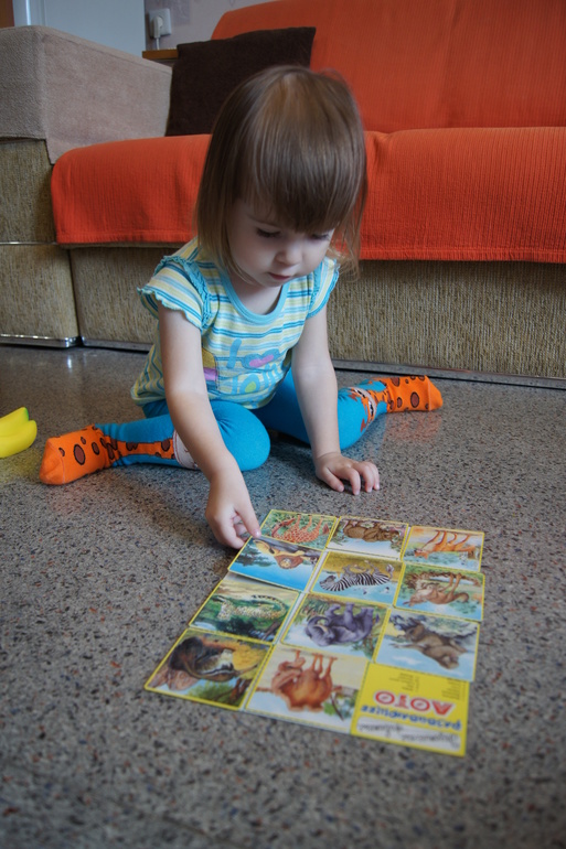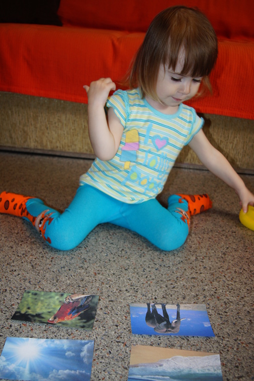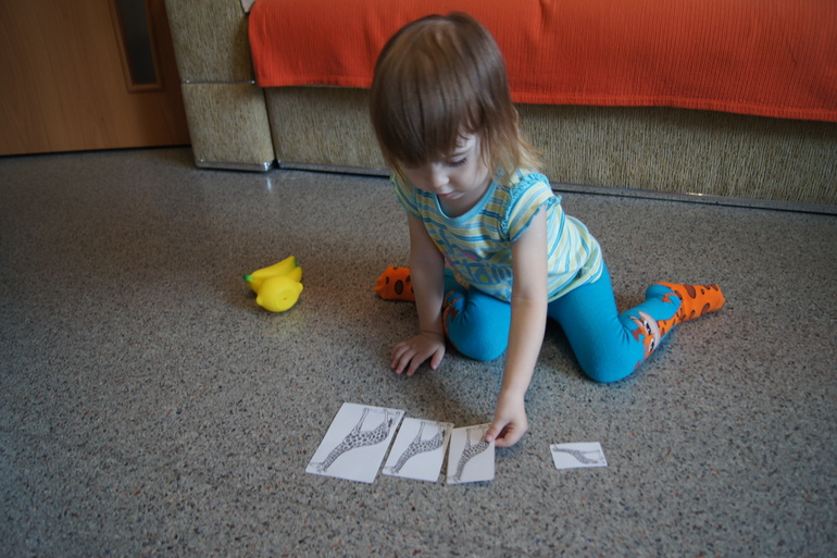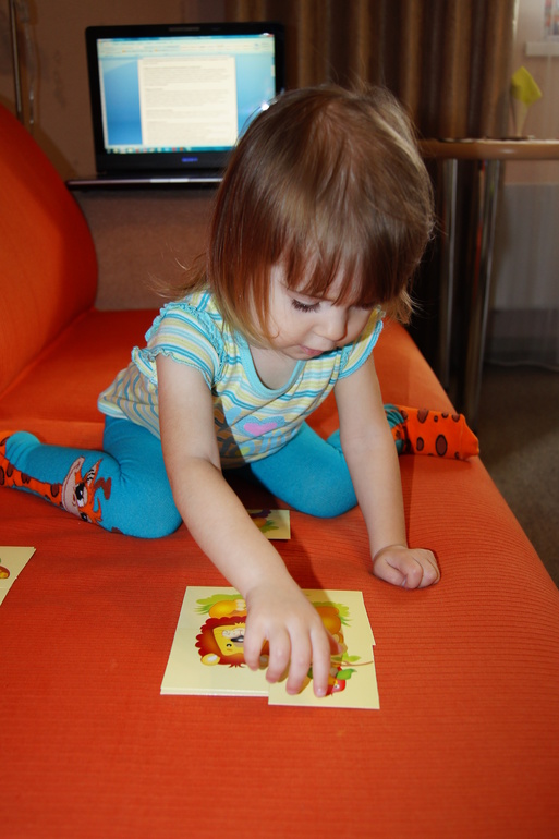 Взяла 8 картинок, выкладывала по 4 карточки в 2 захода. Дала Алисе посмотреть, затем перевернула их и попросила показать, где какая картинка. Отгадала 2 из 4 в каждом случае. Обычно выкладывала по 3 картинки, ошибок не было, поэтому количество картинок решила увеличить.