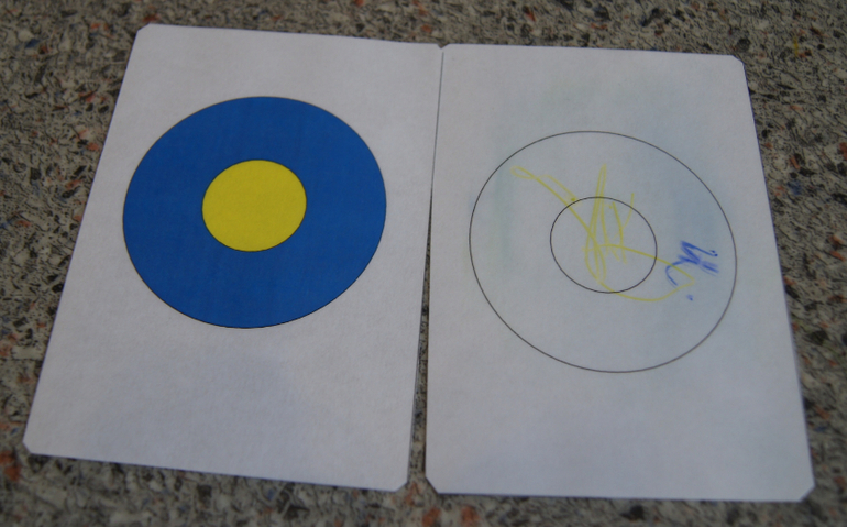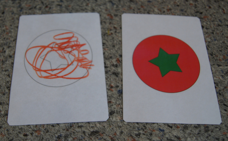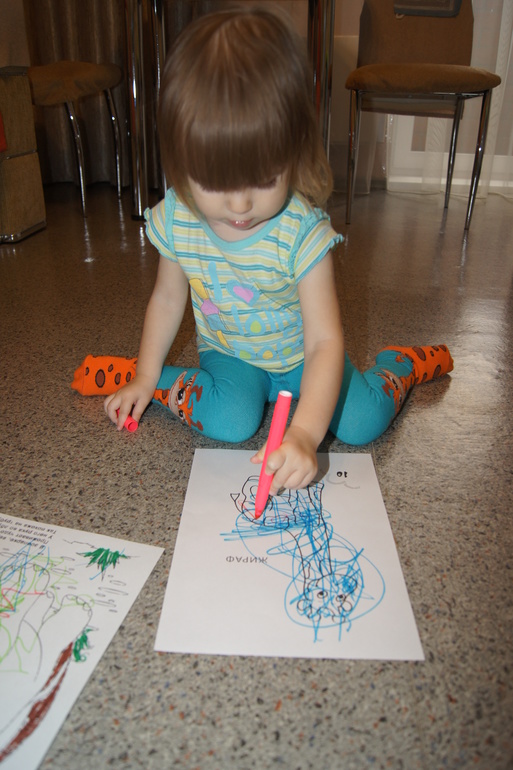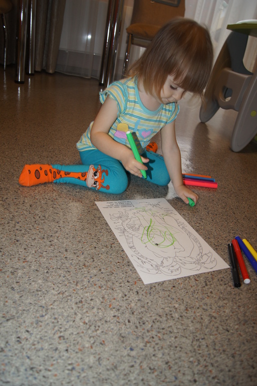 Показала доче цветную мандалу, затем убрала ее, выдала черно-белый вариант и фломастеры, попросила обозначить, где какой цвет. Мандалы было 2, выполнила до конца одну, во второй обозначила только один цвет, а также пыталась именно раскрасить картинки, объяснила ей, что достаточно только показать цвет штрихом.