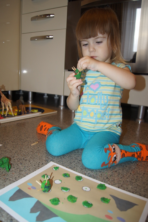 Пока я рассказывала Алисе про Африку, она собрала пазл "Карта мира", вместе нашли Африку, доплыли к ней на корабле, высадили зверей из сенсорной коробочки.