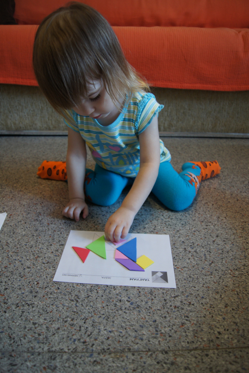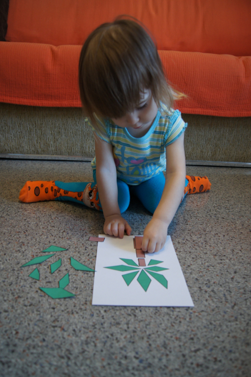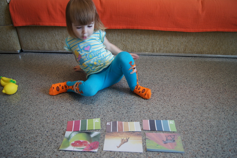 Искали к картинкам их цветовые палитры. До этого я выдавала по 2 картинки, на этом занятии решила увеличить до 3, время раскладывания увеличилось, дочь примеряла цвета к каждой картинке, выполнила 4 из 6.