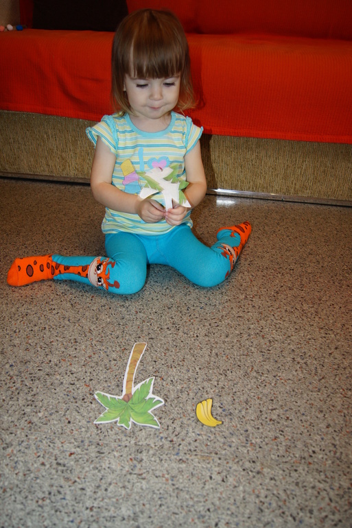 Алисе нравится смешная последовательность. Пока она запоминает 10-12 карточек. История была такая. Однажды апельсин попал на бивень слона, который шел на пляж к попугаю. Ярко светило солнце. И они решили поплыть на корабле к жирафу и носорогу в пустыню, попить чай с лимоном и бананами. Разложила без ошибок. Как таковой рассказ Алиса еще не ведет, я задаю наводящие вопросы, она отвечает и раскладывает.