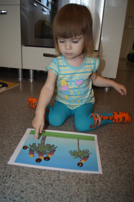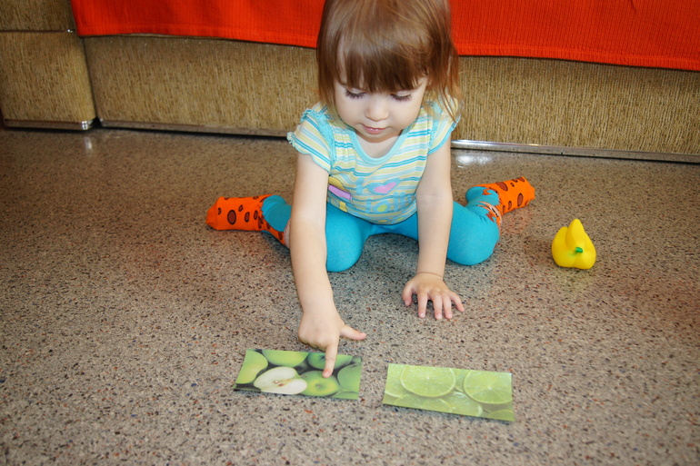 Взяла похожие картинки грейпфуты, зеленые фрукты, слоны и пальмы. Показала Алисе картинку, попросила запомнить ее, потом выкладывала 2 картинки, в том числе и ту которую показывала, просила показать карточку, которую я показывала первый раз. Выполнила без ошибок.