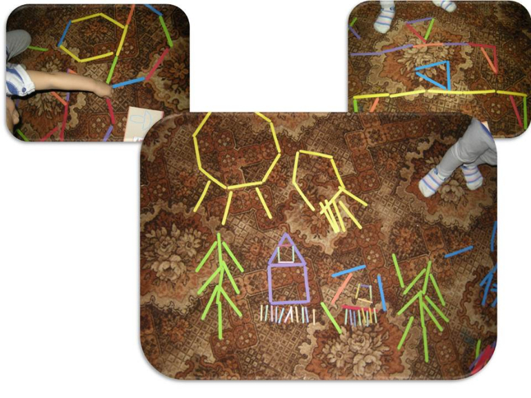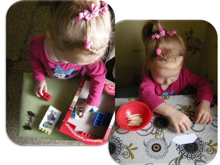 Играли мы в палочки, недавно купили декоративные, это хит игр, ими складываем все и всегда последнее время)) Иногда по карточкам, иногда с головы, часто я складываю, а Вика рядом такое же складывает. На фото мне кажется никто и не заметит разницы между домиками или елками)) Сейчас нашла в Мамы Ани карточки для палочек