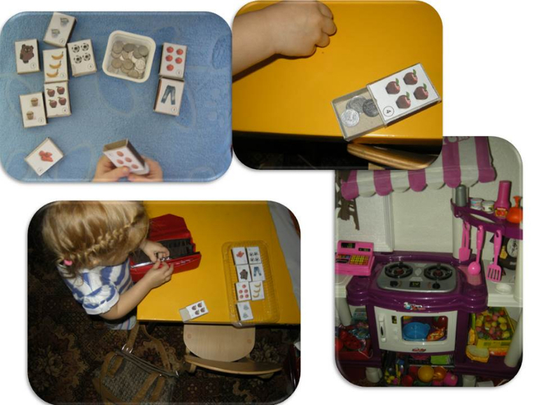 А вот и чудо мини-кассы. Очень понравились. Это наш магазин. Я давно хотела Вике сделать шершавые денежки из наждачки с точки и цифрами, может дойтут ручки, но пока и спичечные коробки очень помогают. Вика не так раскладывала, то мы высыпали на стол, считали и тогда назад вкладывали монетки. Кстати я сначала дала Вике на растерзание, она их наполнила по счету, несколько раз, а лишь потом пошли в магазин.