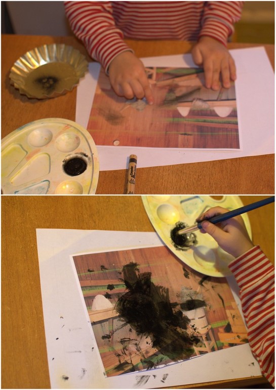 Потом поняли, как это баня по-черному. Посмотрели картинки и "закоптили" стены (дала краску, графит и карандаш, жаль нет художественного угля или сангины). По итогу, конечно, получили Квадрат Малевича:))