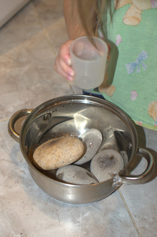 Провели опыт - как вода шипит и испаряется с раскаленных камней (я свои на конфорке раскалила). Алисе очень понравилось плескать на камни, смотреть, как пятна воды быстро исчезают с камня.
