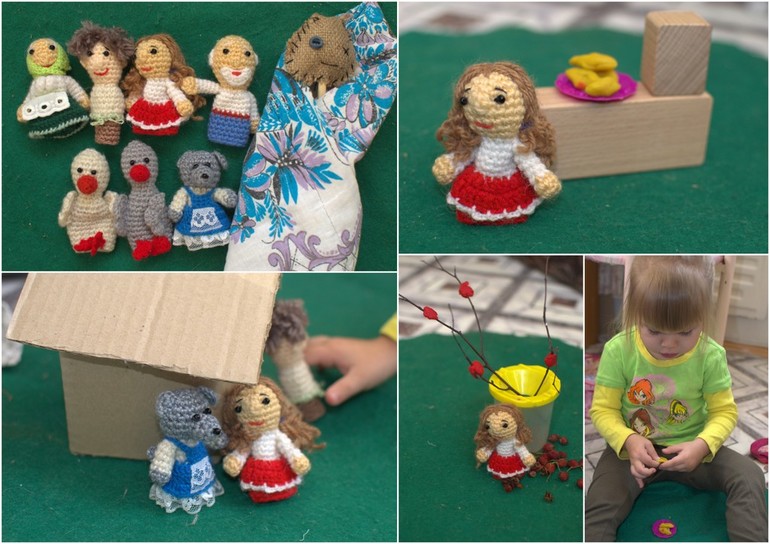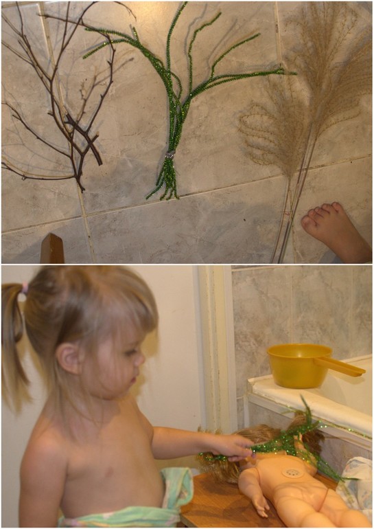 Парились (я еще и корыстную цель преследовала - Алиса кашляет, а ингаляции делать не хочет, поэтому включила горячую воду, поставила в ванной ингалятор с эвкалиптовым маслом, поэтому почти натурально вышло:)) Для сенсорных ощущений пошлепала Алису разными "вениками", просила ее угадывать (веточки, синельная проволока, мягкие пушистики). Потом она то же самое для куклы повторила.