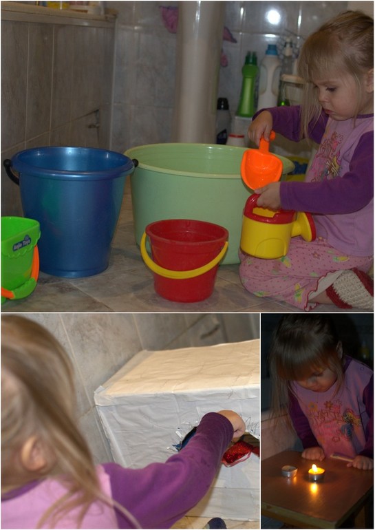 Аттракцион с коромыслом повторять не стали, просто попереливали туда-сюда водичку. Снова "затопили печку", дули на свечки