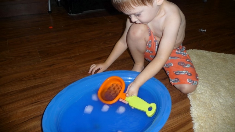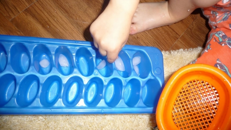 С вечера мы с ребёнком покрасили водичку для катка в голубой цвет и отправили на ночь в морозильник. Параллельно я позаливала несколько дополнительных заготовок "с запасом". Начали мы с айсбергов. Запускали кусочки льда в плаванье и вылавливали их ситечком. Вели непринуждённую беседу об Арктических льдах и их обитателях. Эрик решил складывать выловленную добычу по ячейкам для заморозки льда.