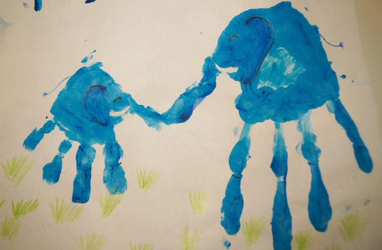 Сделали отпечатки ладошек, сравнили, потом я из них сделала слонов. В альбом вставлю. И вообще решили что сделаем такой "семейный портрет"=)