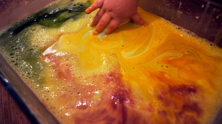 Вылили, но оставили пол стакана мыльной воды. Я добавила туда крахмал, у меня ушло чуть больше одного стакана, до консистенции похожей на масло. И добавила туда красители. Они сначала не перемешиваются, выглядит очень красиво. Сделать фото не успела, Тимофей туда стакан воды налил. Но вот что успела: