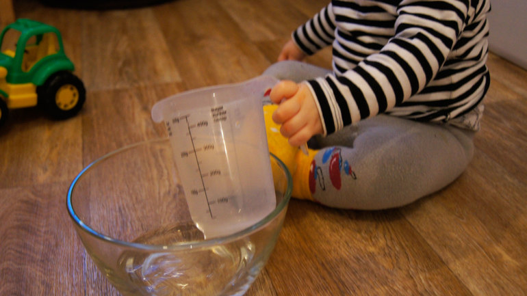 Потом вместе все убирали, по крайней мере Тимофей следил, с тряпкой в руках. Решили продолжить занятия "типа Монтессори". Наливали воду. Малышу пока очень тяжело наливать самому, но он старался, и не пролил ни капли!