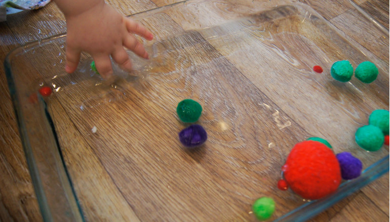 Решили поиграть с сенсорной коробочкой. Достали помпоны, поиграли с сухими, потом налили воды в противень и я дала Тимофею ситечко и ведерко, чтобы он помпоны вылавливал.Но малыш жульничал. Он доставал помпоны руками, ситечком бил по воде, а когда в воде оставался один помпон высыпал все обратно. Он любит играть в воде, и частенько просит миску с водой чтобы поиграть.