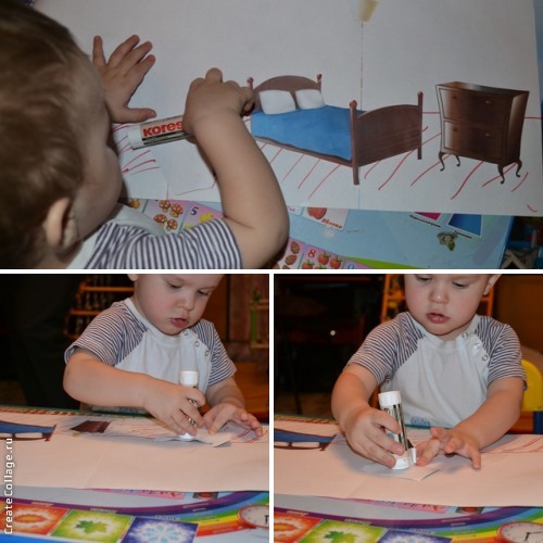 Затем делали аппликацию(я все распечатала из приложения, соединила листы А4 скотчем, и наметила где пол красным). Могу сказать что клеить мы полюбили не так давно и конечно для ровности делаем с моей помощью, поклеили,обсудили в какой комнате что должно быть.