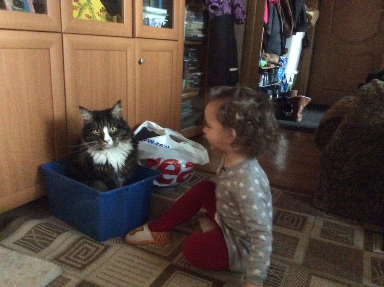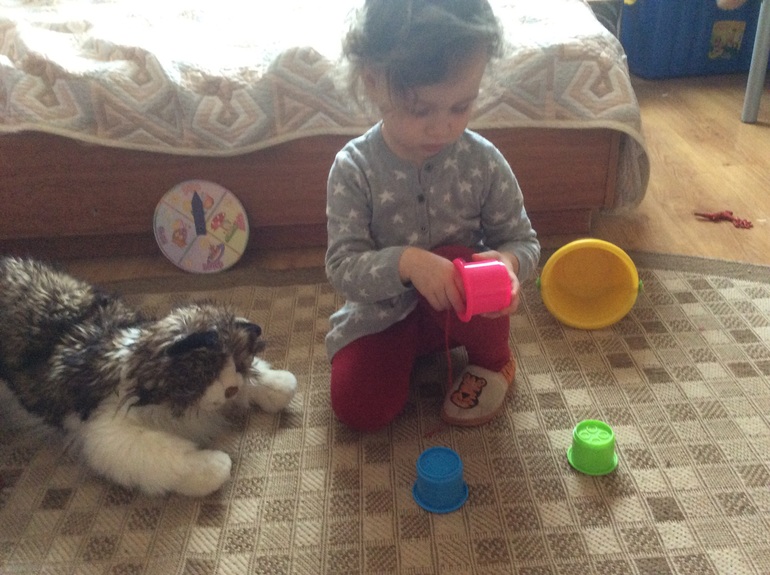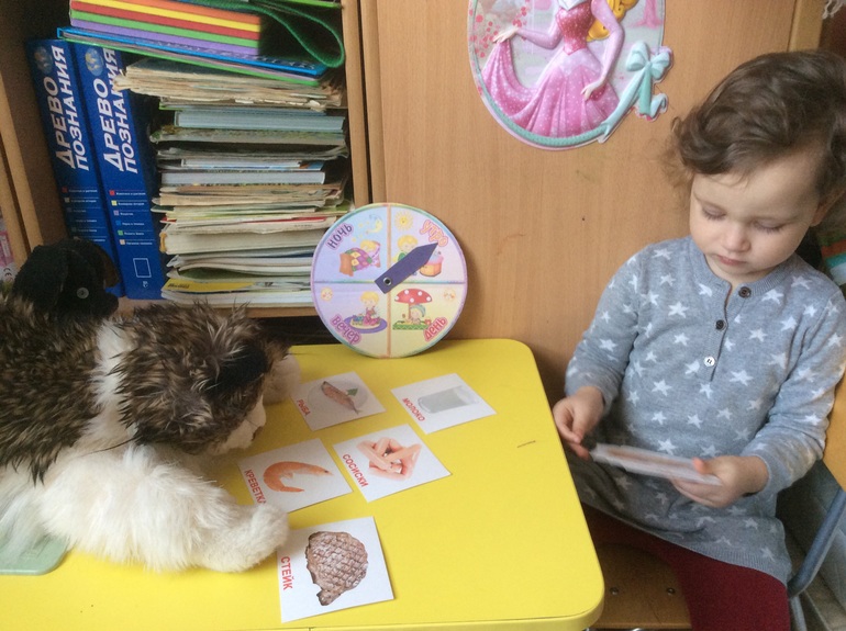 Поговорили о том, что делают утром, поиграли с котиком,покормили его( использовали свои карточки, так что накормили и Полю,и маму).