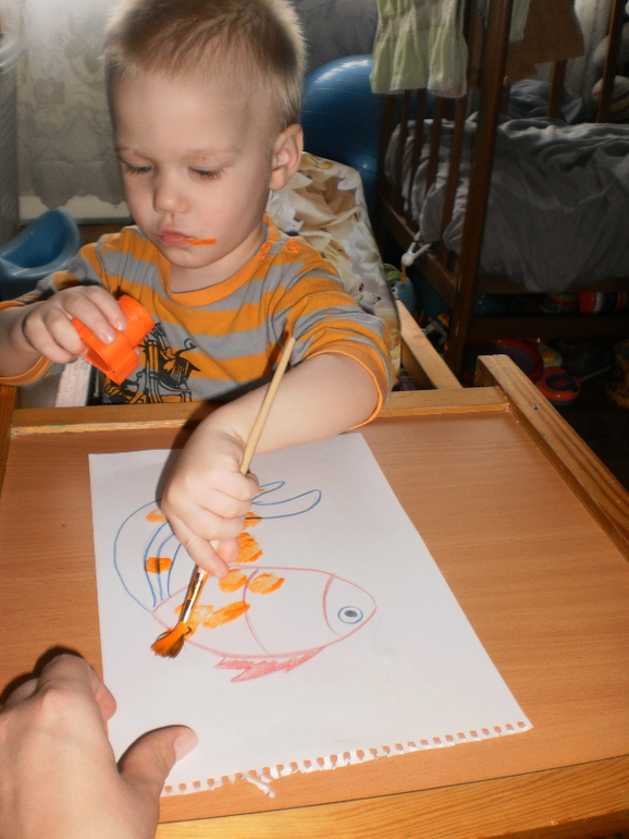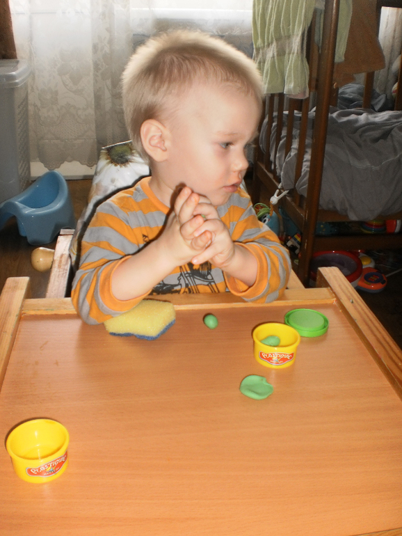 Из творчества была у нас раскраска рыбка и лепка из теста лепешек. Сам пытался катать колобки из теста.