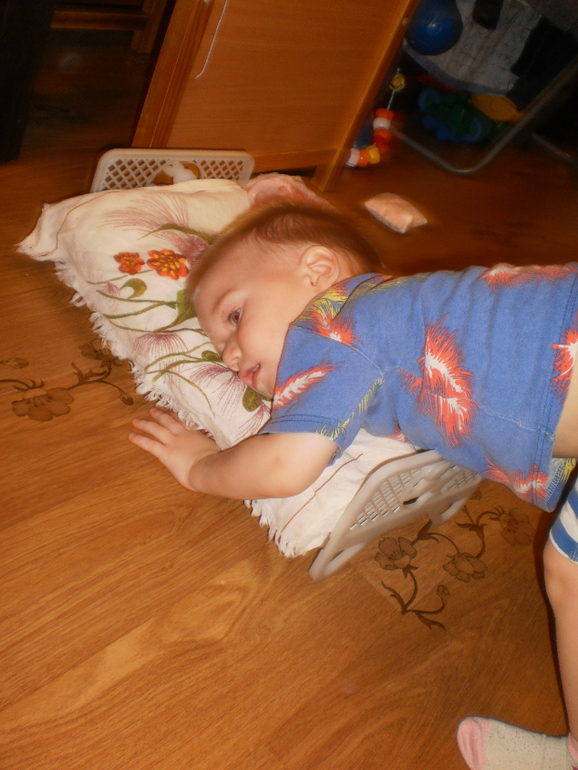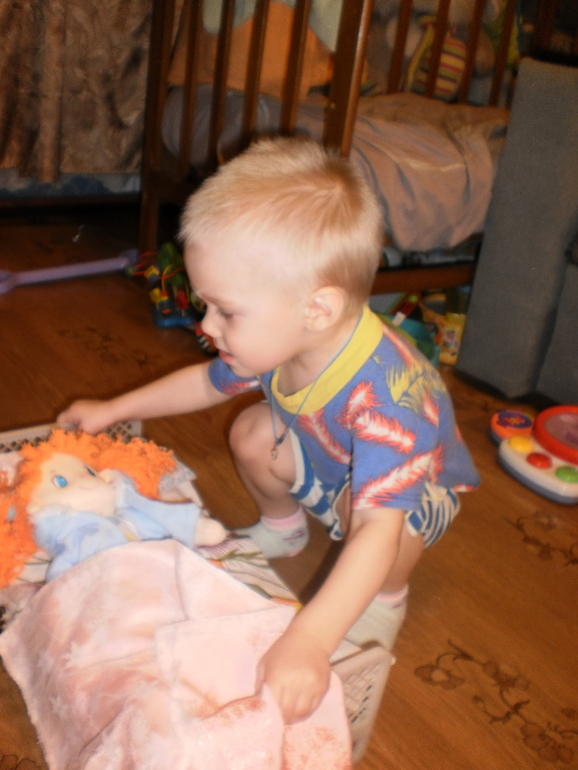 Перед сном укладывали куклу спать, пели колыбельную а-ааа-а, качали кровать)) Макс так устал, что сам решил прилечь.