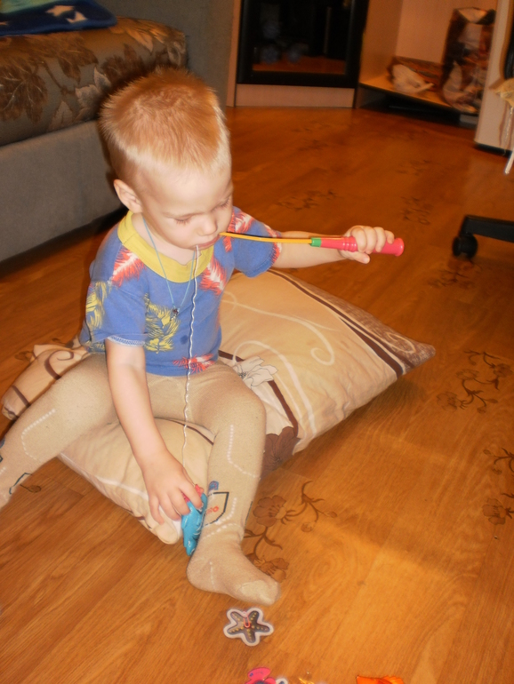 После дневного сна и полдника пытались дуть на бантик и играть в хоровод. Точнее сказать придумывали движения до стишок про хоровод, мышей и кота. Устроили рыбалку.