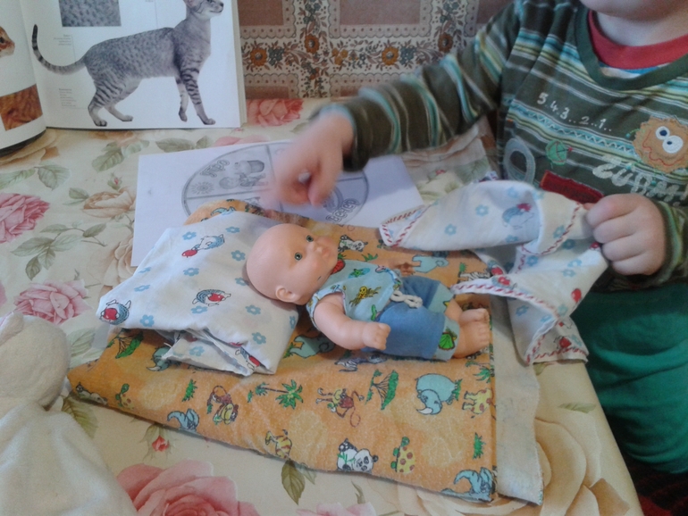 Ну и еще мы уложили пупса спать, я спела колыбельную, Мишутка качать не захотел, но старательно укутывал малыша.