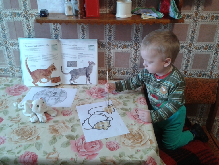 рассмотрели часы, потом к намв гости пришел котик. Нашли у него все части тела, потом долго рассматривали энциклопедию про кошек. Рисование -это был наш первый опыт, спасибо Светлане, я все не решалась дать ребенку кисточку и краски. Все оказалось не так уж и страшно.