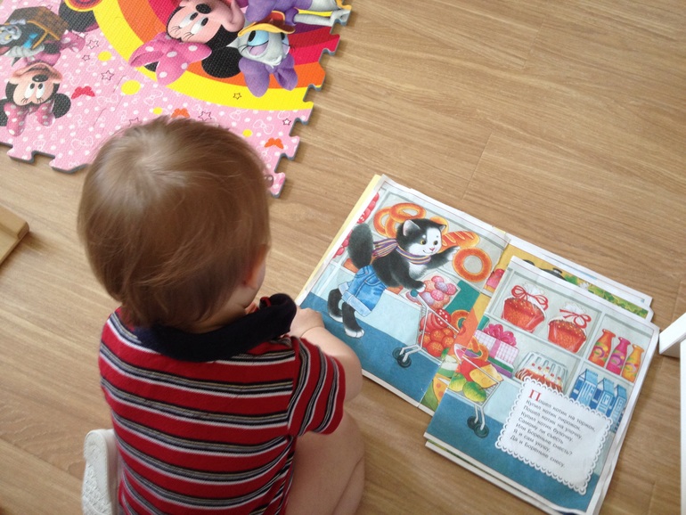 Дальше, Лизонька начала листать книжку с потешками и показывать на спящую кошечку, поэтому было решено лечь спать.