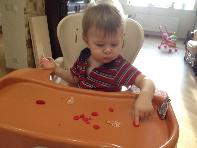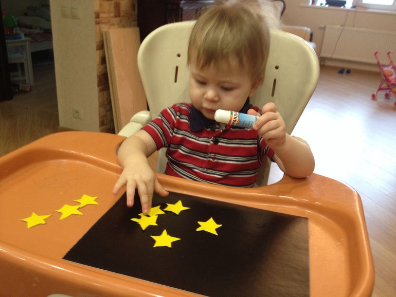 После сна, мы перевели стрелки на день. Покушали, поговорили о том, что едят кошечки. Я налила блюдечко молока, Лиза напоила нашу кошку, потом она искала рыбок в фасоли ( уж очень ей это занятие нравится) и делала лепешки из красного теста. Когда кошечка наелась, а Лизку надоело возиться с тестом, мы решили с кошечкой поиграть. Я привязала к ленточке бантик, показывала как на него дуть. Лизку это занятие очень понравилось, дули и ползали за бантиком мы минут 30. Потом пошли гулять, на улице тоже искали котиков и мяукали что есть мочи. После прогулки на улице уже стало темнеть и мы решили сделать аппликацию со звездами. Делали мы ее в первый раз. Я показывала как намазывать звездочки клеем, а Лизочек приклеевала их к небу. Потом она начала зевать, послушали колыбельную раза 3 и завалились на второй сон. Вечером, когда проснется, хочу еще немножко порисовать. Вот что у нас получилось.
