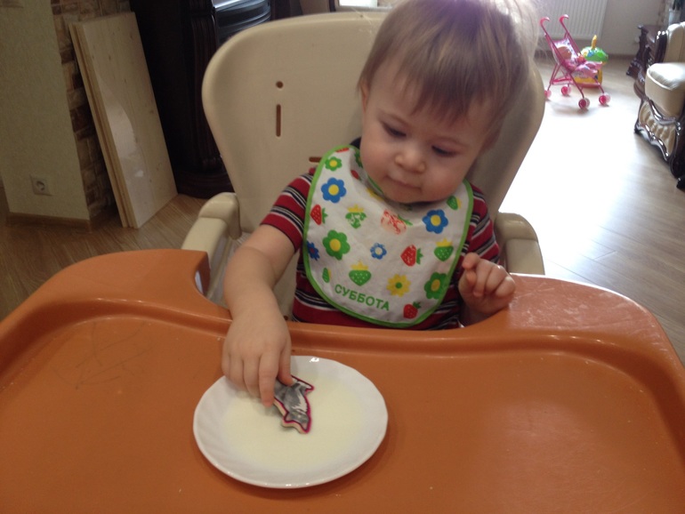 Утро у нас началось с замечательных часов: вспомнили, что мы делаем утром: умылись, попытались очередной раз почистить зубки, позавтракали кашей.
