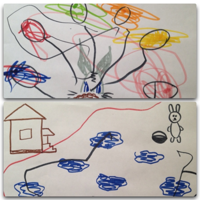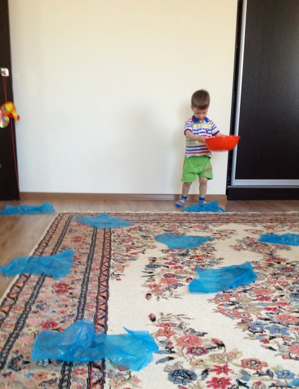 И правда, чего два дня подряд красить? Миша еще постарался на второй день, разукрасил в разные цвета. Лёня все малюет одним карандашом.А подобные пакетные лужи дома перескакиваю только я, Лёня с шалостью в них садится и сообщает, что промочил штаны.